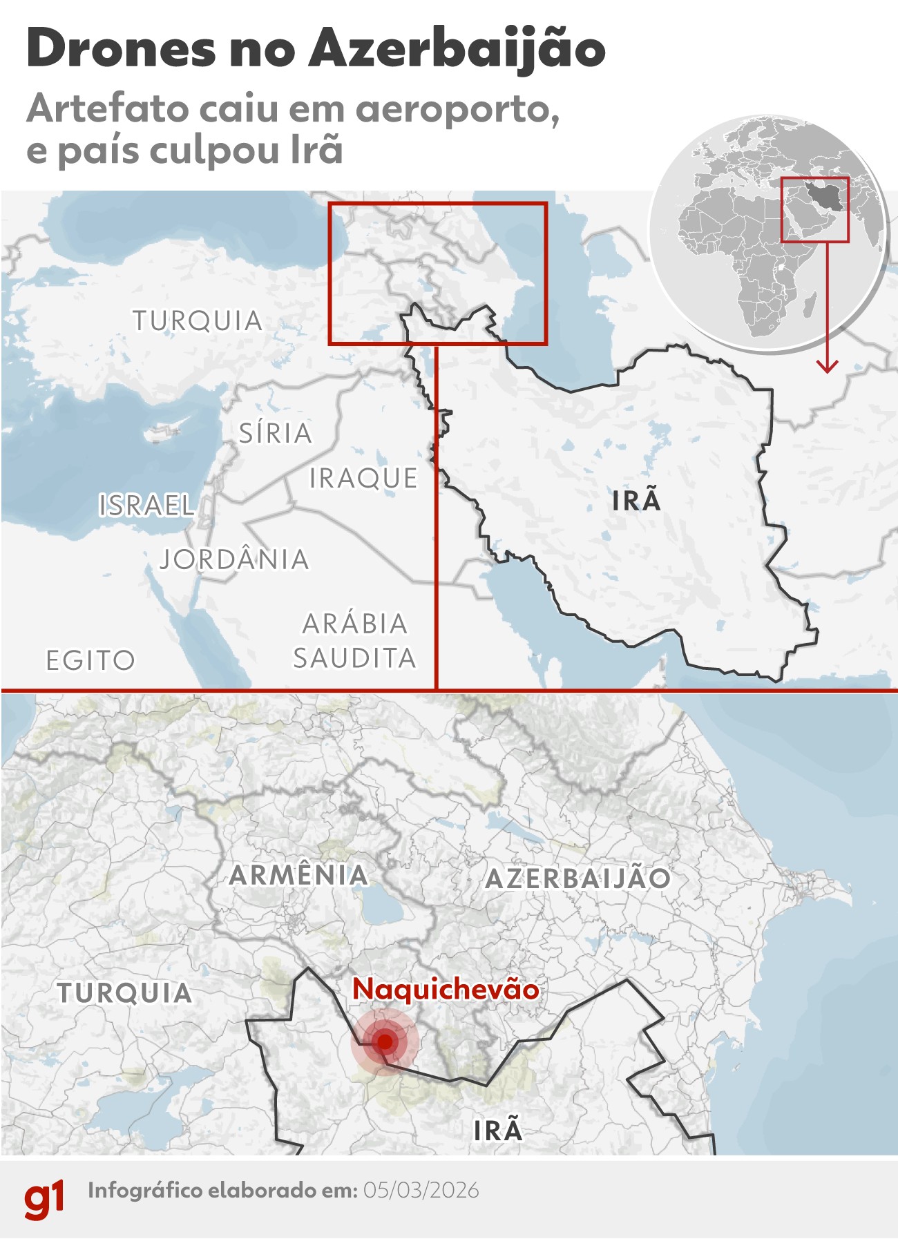 Drone explode no aeroporto de Nakhchivan, no Azerbaijão Drones militares atingiram nesta quinta-feira (5) um aeroporto e uma escola no Azerbaijão, segundo o Ministério das Relações Exteriores azerbaijano. O ministério disse que os drones foram dispardos pelo Irã, que negou o ataque. Um vídeo registrou o momento em que um dos artefatos explode ao atingir o solo (veja acima). Duas pessoas ficaram feridas, segundo o governo local. O Azerbaijão acusou o Irã pelo ataque e disse ter convocado o embaixador iraniano para apresentar explicações. O governo iraniano, no entanto, negou ter disparado os drones, segundo a mídia estatal do país. Ainda assim, o presidente do Azerbaijão prometeu represálias. Mapa mostra região do Azerbaijão atingida por drones que governo azerbaijano disse ser do Irã, em 5 de março de 2026. arte/ g1 Segundo o governo do Azerbaijão, um dos drones caiu em um aeroporto em Nakhchivan, perto da fronteira com o Irã, e o outro próximo a uma escola. Em um comunicado, o ministério condenou os ataques, exigiu explicações do Irã e afirmou que o Azerbaijão se reserva o direito de tomar "medidas de resposta apropriadas". "Condenamos de modo veemente os ataques de drones lançados a partir da República Islâmica do Irã", disse, em nota, o Ministério das Relações Exteriores do Azerbaijão. O comunicado afirma ainda que o episódio "aumenta as tensões na região". Momento em que drone atinge o solo em um terminal de aeroporto em Nakhchivan, no Azerbaijão, que acusou o Irã pelos disparos, em 5 de março de 2026. Redes Sociais via Reuters ➡️ Embora não tenha se envolvido no conflito do Oriente Médio até agora, o Azerbaijão vem enfrentando tensões com o vizinho Irã nos últimos anos. Isso porque o governo azerbaijano compra armas de Israel, e Teerã acusa o governo israelense de utilizar o espaço aéreo do Azerbaijão para ter mais proximidade em ofensivas ao território iranaino. Nakhichevan, onde fica o aeroporto alvejado, é um exclave autônomo do Azerbaijão e fica entre Armênia, Turquia e Irã. INFOGRÁFICO - Conflito entre EUA, Israel e Irã entra no 6º dia. Arte/g1 Veja os vídeos que estão em alta no g1