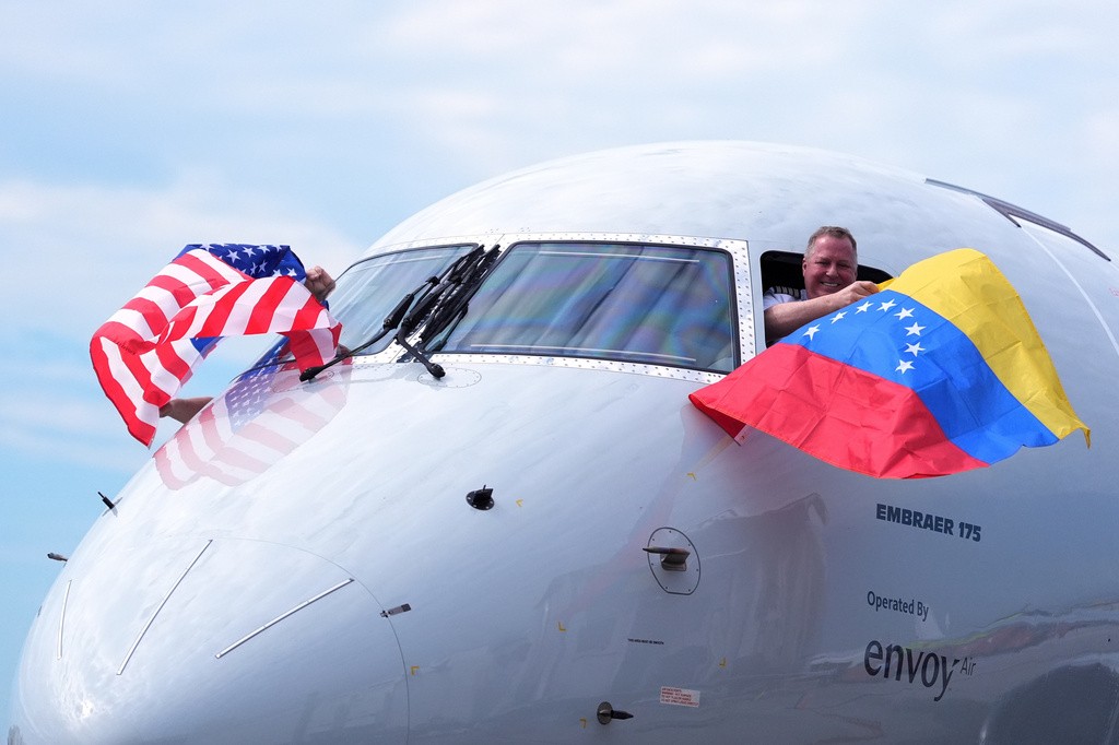 (Foto: Reprodução) O capitão Ric Wilson acena com uma bandeira venezuelana e o primeiro oficial acena com uma bandeira dos EUA no primeiro voo comercial direto entre os Estados Unidos e a Venezuela em sete anos, na quinta-feira, 30 de abril de 2026.